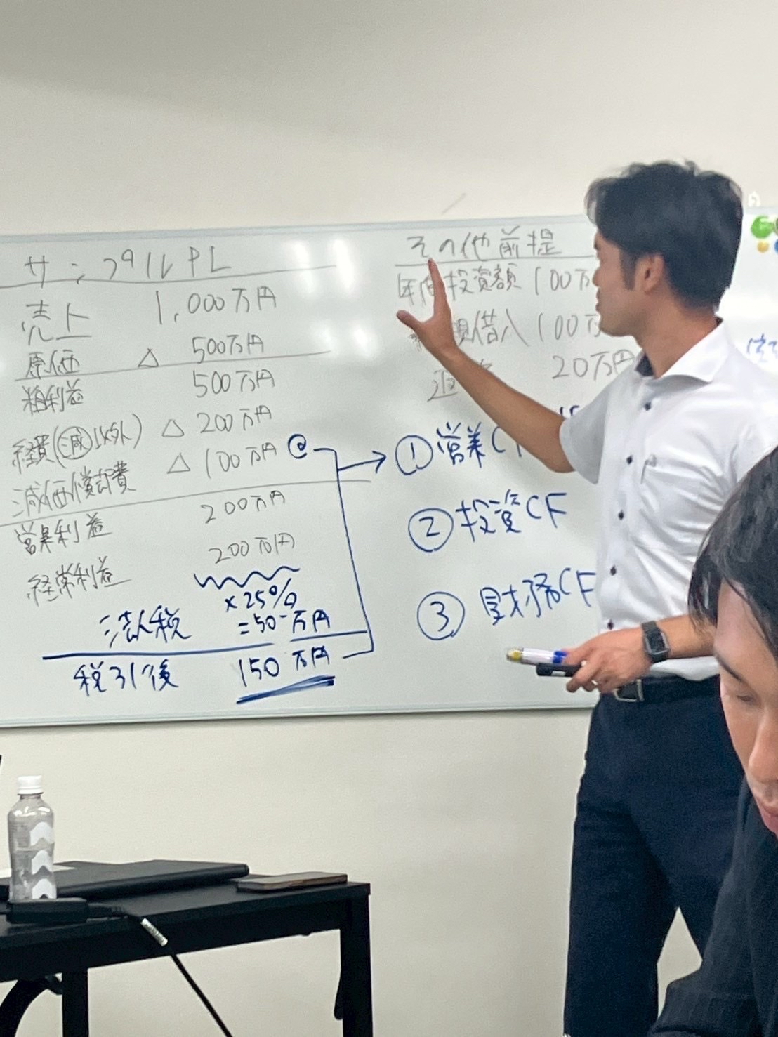 後半では、簡易的なキャッシュフロー計算の演習を行い、数字の動きが経営判断や資金管理にどのようにつながるかを学ぶ内容となりました。
