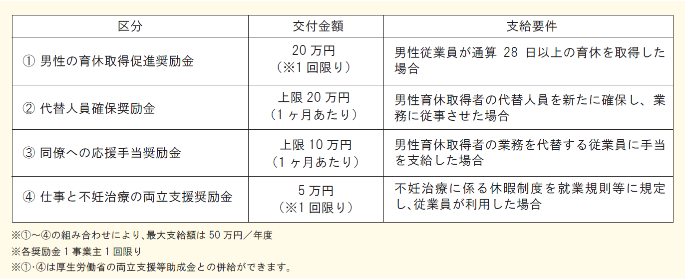 この制度には4 つの区分があり、事業主はそれぞれの取り組みに応じて交付を受けることができます。