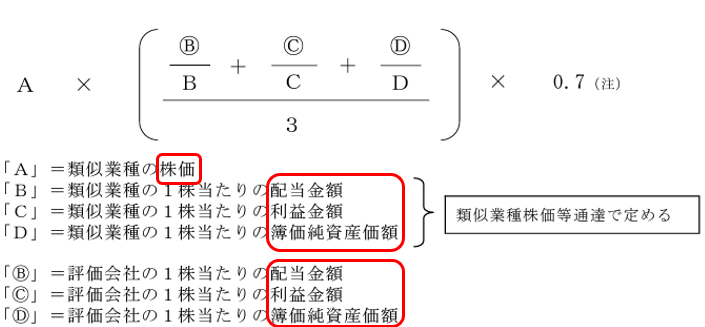 類似業種株価×類似業種に対する評価会社の配当・利益・純資産の割合の平均×規模別斟酌率(0.7,0.6,0.5)