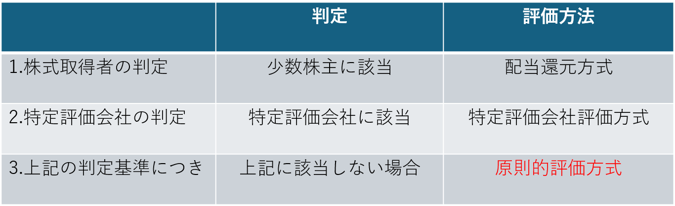 今回ご紹介する取引相場のない株式等の評価方法は、「株式取得者の判定」と「特定評価会社の判定」により、大きく3つのパターンに分けられます。