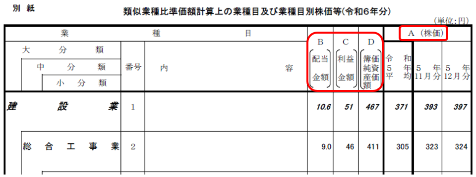 計算に必要な類似業種の株価(A)、配当金額(B)、利益金額(C)、簿価純資産価額(D)は、国税庁ホームページの「類似業種比準価額計算上の業種目及び業種目別株価等」で確認します。